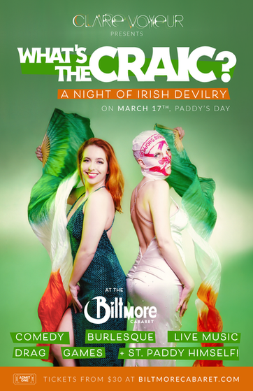 WHAT'S THE CRAIC - A Night of Irish Devilry evolved out of Clare Voyeur's desire to create a burlesque act as Blindboy. Having Irish friends and some ancestry to influence her, she wanted to create a show to celebrate the talents of Irish born performers, those of Irish ancestry or dedication to Irish arts and culture. This variety show includes standup comedy, burlesque, dance, live music, surprise appearances, short films, games and much more! Each round features a new mix of performers. WHAT'S THE CRAIC had its debut on Paddy’s day in 2022 at The Biltmore Cabaret and has grown in size and now runs at The Rio Theatre. Since 2023 the show has been featured as part of Celtic Fest Vancouver's programming and has been a great success!